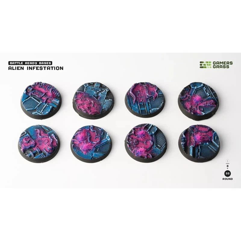 Ce blister contient 8 socles ronds thermoplastiques de 32 mm de large Battle Ready Bases, sur le thème de l’infestation extraterrestre.