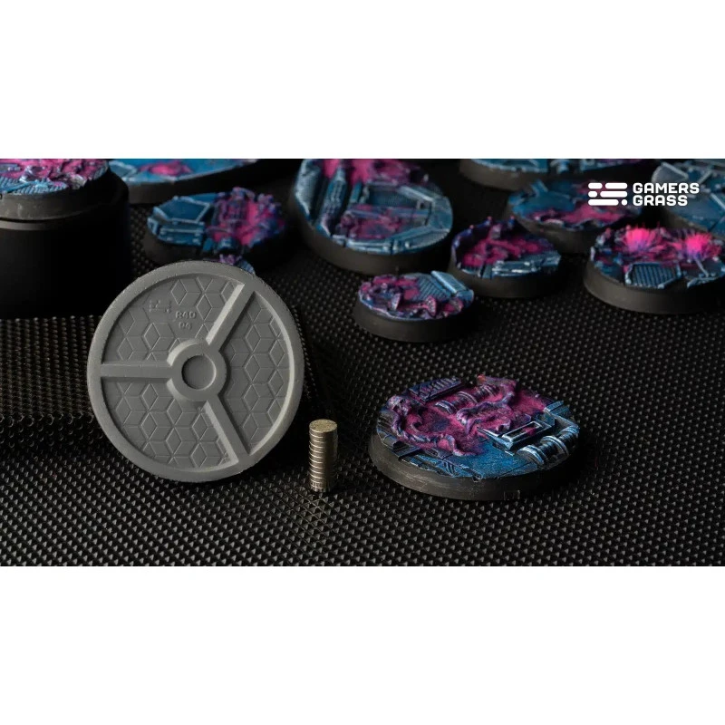 Ce blister contient 5 socles ronds thermoplastiques de 40 mm de large prêts pour le combat, sur le thème de l’infestation extraterrestre.