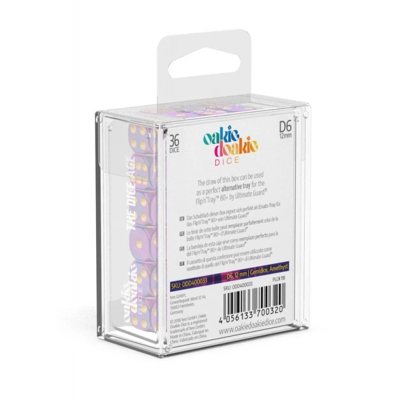 Les dés D6 sont disponibles en sets de 12 pièces (16 mm) ou 36 pièces (12 mm) et sont emballés dans une boîte rigide avec un tiroir amovible pour y accéder rapidement et jouer n’importe où.