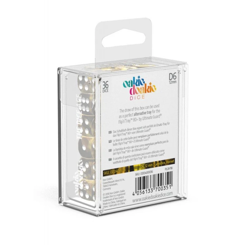 Les dés D6 sont disponibles en sets de 12 pièces (16 mm) ou 36 pièces (12 mm) et sont emballés dans une boîte rigide avec un tiroir amovible pour y accéder rapidement et jouer n’importe où.