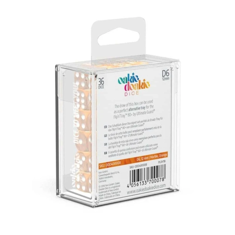 Les dés D6 sont disponibles en sets de 12 pièces (16 mm) ou 36 pièces (12 mm) et sont emballés dans une boîte rigide avec un tiroir amovible pour y accéder rapidement et jouer n’importe où.