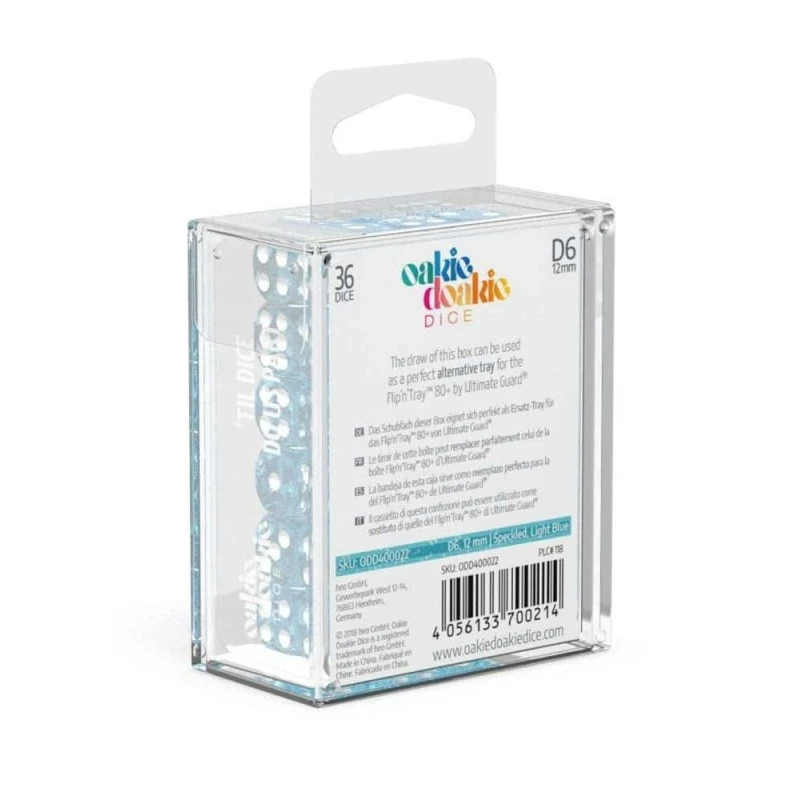 Les dés D6 sont disponibles en sets de 12 pièces (16 mm) ou 36 pièces (12 mm) et sont emballés dans une boîte rigide avec un tiroir amovible pour y accéder rapidement et jouer n’importe où.