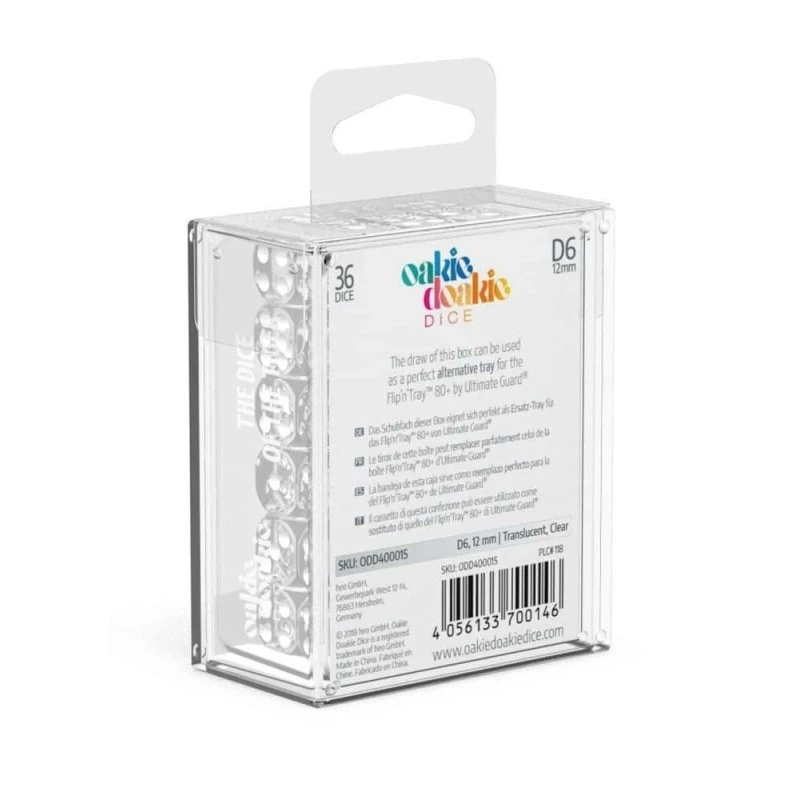 Les dés D6 sont disponibles en sets de 12 pièces (16 mm) ou 36 pièces (12 mm) et sont emballés dans une boîte rigide avec un tiroir amovible pour y accéder rapidement et jouer n’importe où.