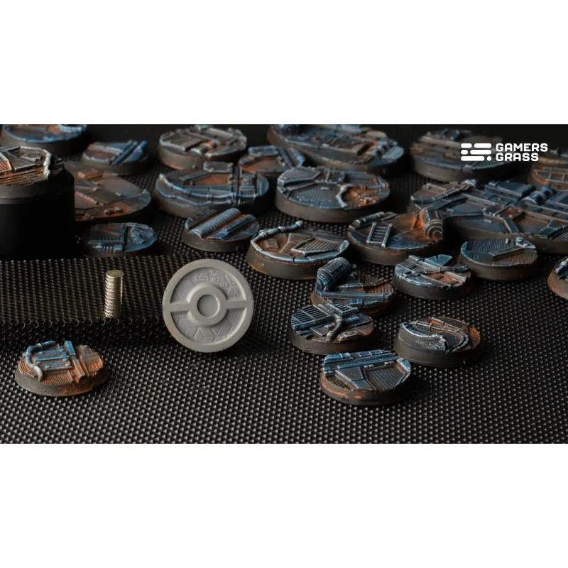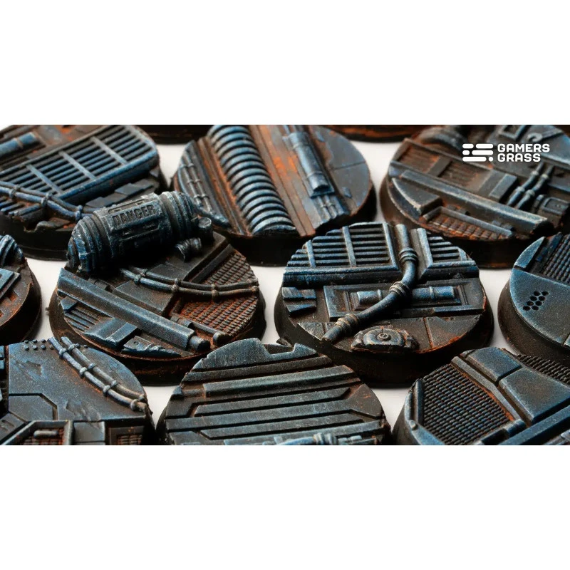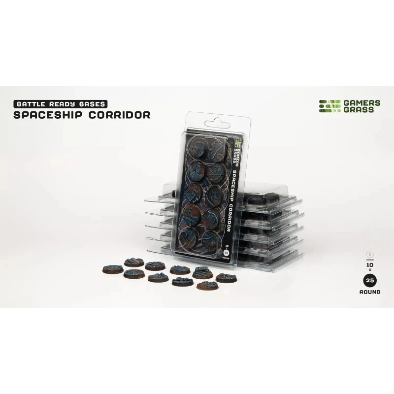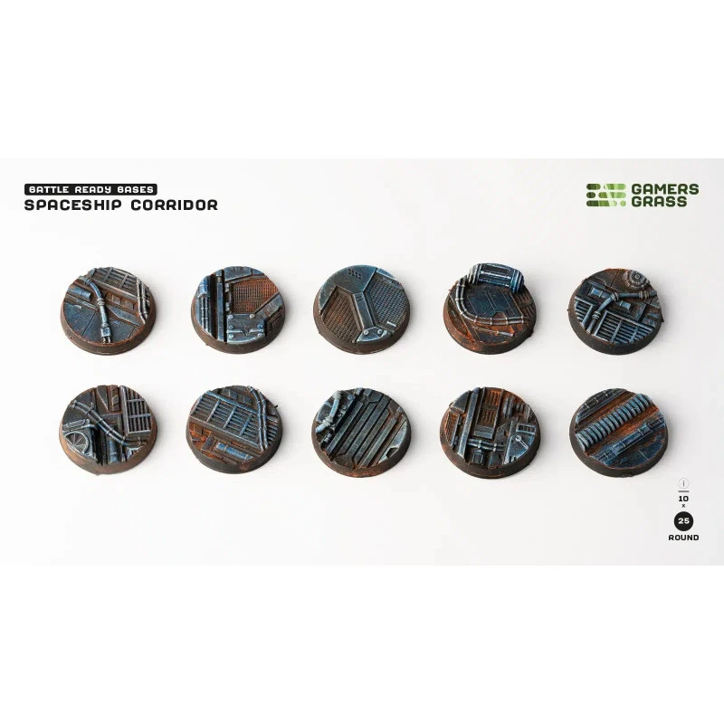 Ce blister contient 10 socles ronds thermoplastiques de 25 mm de large prêts pour le combat, sur le thème des couloirs de vaisseaux spatiaux.