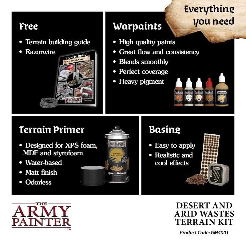 Que vous vous prépariez à construire des dunes de sable désolées ou des terres brûlées, le kit de terrain GAMEMASTER : Deserts & Arid Wastes vous fournira toutes les peintures et tous les matériaux de base dont vous avez besoin pour créer des décors étonnants pour n’importe quel système RPG ou jeu de figurines d’escarmouche.