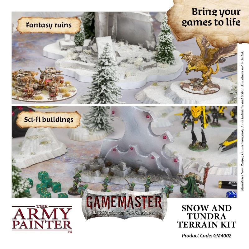 Que vous vous prépariez à construire des crêtes glacées ou des structures en béton glaciales, le kit de terrain GAMEMASTER : Snow & Tundra vous fournira toutes les peintures et tous les matériaux de base dont vous avez besoin pour créer des décors étonnants pour n’importe quel système RPG ou jeu de figurines d’escarmouche.