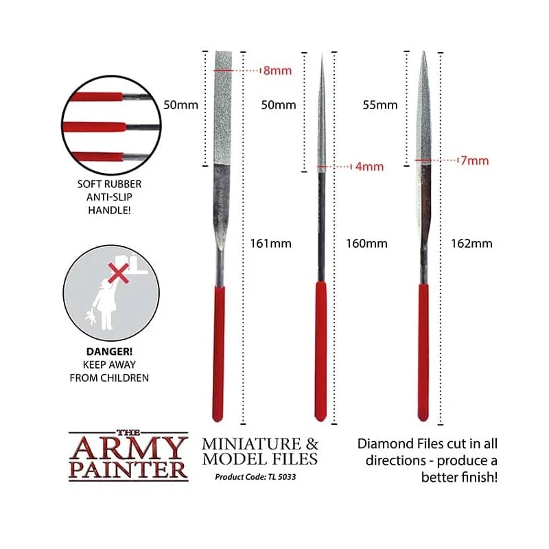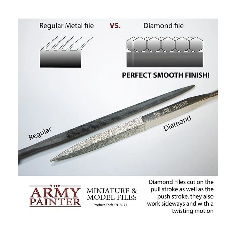 Ces limes diamantées sont des outils extrêmement polyvalents pour le wargamer et le hobbyiste. Elles sont indispensables pour les conversions personnalisées et le nettoyage des lignes de moulage, ainsi que pour la préparation des pièces à coller.