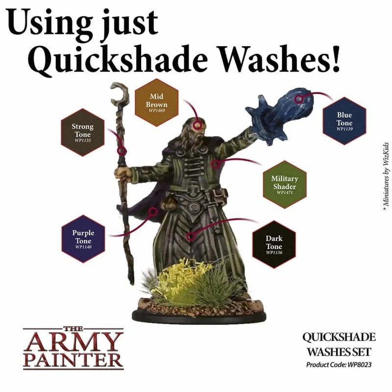Ce set contient onze Quickshade Washes. Ces produits sont probablement les meilleurs du secteur et vous permettront d’obtenir un ombrage parfait à chaque fois et d’ajouter un ton de couleur à vos figurines. Toutes les bouteilles de Quickshade Wash correspondent à 100% aux boîtes de vernis Quickshade correspondantes.