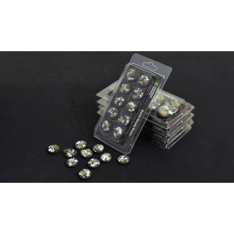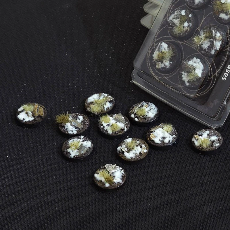 Ce paquet contient 10 socles ronds Battle Ready Bases de 25 mm de large sur le thème de l’hiver.
